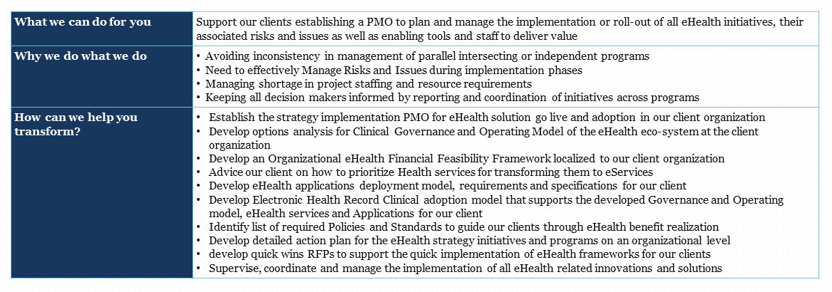 From a clinical governance and digital health prospective, we will help our clients build a customized project management proven methodology to ensure the success of their transformation.