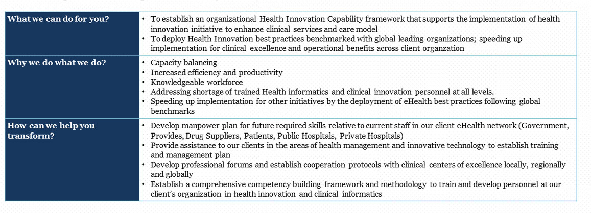 We are capable of developing your Health Innovation Capacity with emphasis on population health and engage stakeholders to exceed patient expectations