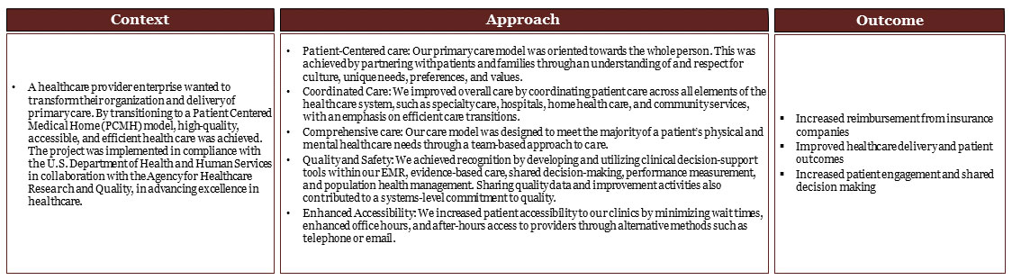We achieved recognition as Patient Centered Medical Home through organizational transformation of healthcare delivery.